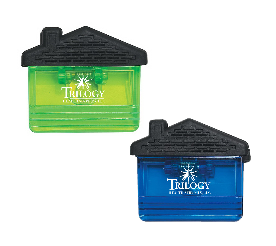 House shape clip with spring loaded hinge and magnet on back side. Black top rubber grip and large imprint area.