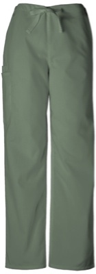 A casual Unisex pant features a natural rise and an adjustable webbed drawstring at the waist, one back pocket, and a cargo pocket with an inside cell phone pocket. Inseam 33.5".