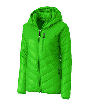 Hooded~Quilted shell~Left chest pocket engineered for embroidery~Full zip~Zip front pockets~Elastic binding at cuff and hem~Two access points for embroidery~Water resistant~Temperature rating -5 to 45 degrees.