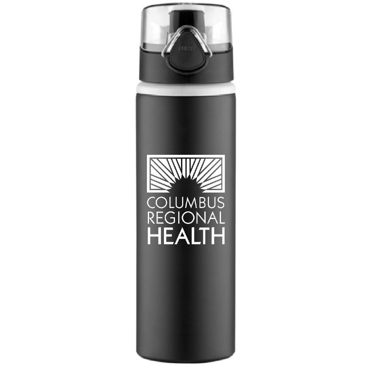 Measuring 10" H x 2 7/8" diameter, the Hermosa holds up to 27 oz. and is made of aluminum. The BPA free bottle features a bold color matte finish with a light gray plastic lip accent, matching color plastic press-n-flip cap with clear acrylic lid and attached loop. This item is not microwave or dishwasher safe.