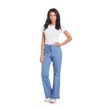 Comfort meets style with our natural, relaxed flare pant that features a drawstring front with elastic-back waist. This figure-flattering design also provides plenty of storage with two side entry pockets, two layered cargo pockets and an instrument pocket. Side vents on leg allow for easy movement. With all of these features they are sure to be your new workday favs. Natural Relaxed Flare 65% Poly 35% Cotton