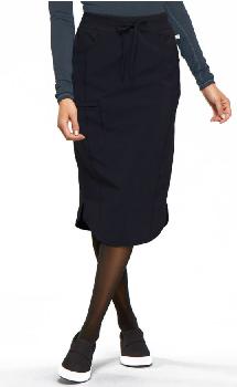 This tapered skirt features an elastic knit waistband, adjustable drawstring, rib-knit front and back yokes, front pockets, front seams with a zip closure cargo pocket, two back patch pockets, shirttail hem, side vents, and coverstitch detail throughout. Contemporary fit. Center back length: 30". The comfortable stretch poplin fabric and super stretchy rib-knit is the perfect combo for healthcare professionals.